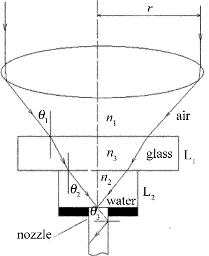 激光耦合即激光束在微水束中發(fā)生多次全反射后形成高能量束并在微水束中傳輸?shù)倪^程。耦合期間激光束要依次經(jīng)過空氣層、玻璃層L1、水層L2并進入到水束光纖的開始端[13-14],如圖 1所示。