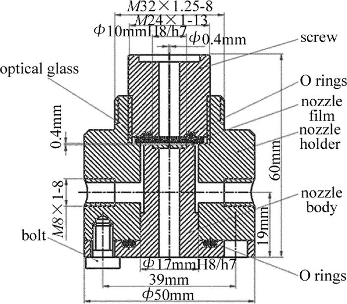 耦合裝置是實現(xiàn)激光與微水束耦合并傳輸?shù)年P鍵部件。耦合裝置主要由噴嘴體、進水孔、O型圈、噴嘴支架等組成,如圖 2所示。本文中將噴嘴設計成圓柱形,目的是為了延長微水束的破碎長度。考慮到激光的能量密度比較大,且激光要在噴嘴內(nèi)部發(fā)生全反射,故噴嘴材料選用耐熱性比較好的銅。各參量具體數(shù)值為:噴嘴長度為10mm,噴嘴直徑為0.4mm,耦合間隙為0.4mm。噴嘴體頂部的定位圓柱體6與噴嘴支架4通過螺紋連接,高壓水從左右兩側(cè)的注水口注入耦合裝置,并進入噴嘴體與光學玻璃之間形成的耦合間隙,然后通過噴嘴片上的噴嘴將耦合之后的光液高能束噴射出來。圖 3為耦合裝置的實物照片。