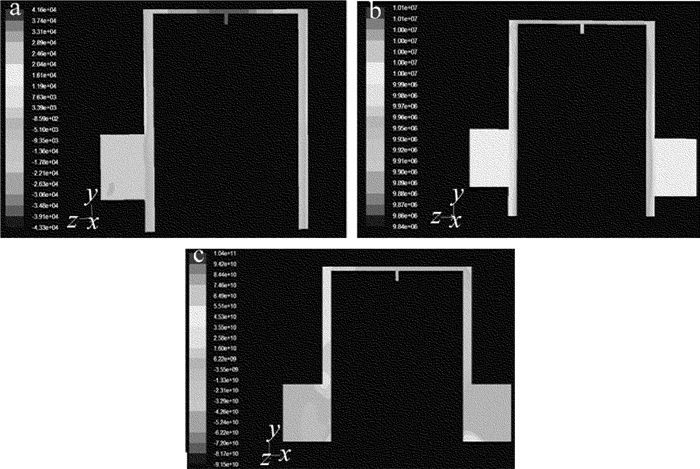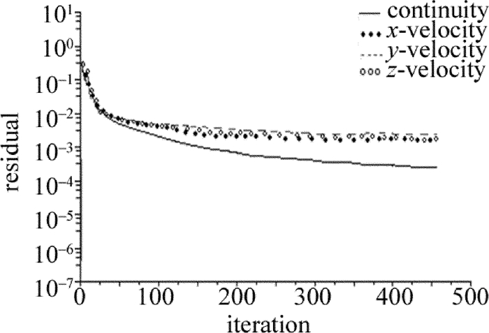 首先是殘差圖的收斂計算,設計的收斂參量為1×10-3。圖 4為殘差圖的收斂計算結(jié)果,橫坐標為迭代次數(shù),縱坐標為殘差值的大小。圖 5為單注水口耦合腔頂部水流入口壓力分布圖,縱坐標為水束壓力大小(MPa)。由圖 5可以看出:當水束壓力為10MPa時,水流入口處壓力分布非常不均勻,具有明顯的各向異性,且注水口一側(cè)的壓力明顯較大;隨著水束壓力的不斷增大,水束壓力的各向異性逐漸減弱,在水束壓力達到20MPa時,入口的水壓趨近均勻。