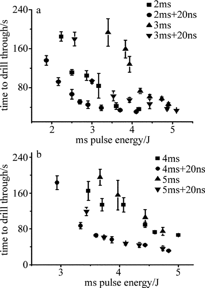 比較不同毫秒脈寬下的打孔時間可知,當毫秒脈沖能量一定時,脈寬越長,打孔時間也越長。當毫秒脈沖的能量增加到一定值后,打孔時間不再減小,打孔速率不再提高,再增加毫秒脈沖的能量沒有意義,毫秒脈沖能量存在一個值。